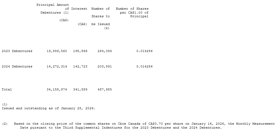 The table below summarizes the details for the shares to be issued on Feb. 2, 2026, to holders of the 2023 debentures and the 2024 debentures in settlement of the monthly interest due on that date.