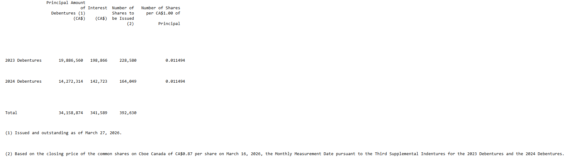 The attached table summarizes the details for the shares to be issued on March 31, 2026, to holders of the 2023 debentures and the 2024 debentures in settlement of the monthly interest due on that date.