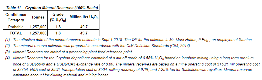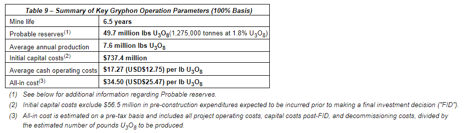 Over all, 49.7 million pounds U3O8 over 1.26 million tonnes grading 1.8 per cent U3O8 are planned to be extracted from Gryphon over an approximately 6.5-year mine life.