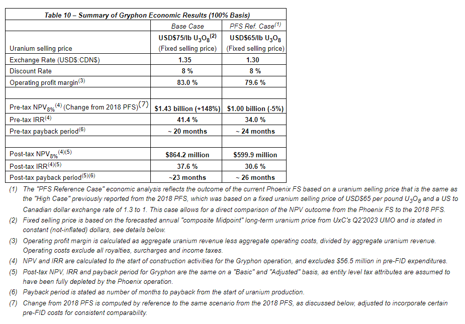 The PFS reference case economic analysis reflects the outcome of the current Gryphon update based on a uranium selling price that is the same as the high case previously reported from the 2018 PFS, which was based on a fixed uranium selling price of $65 (U.S.) per pound U3O8 and a U.S. to Canadian dollar exchange rate of 1.3 to 1. This case allows for a direct comparison of the NPV outcome from the Gryphon update to the 2018 PFS.
