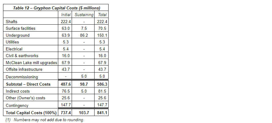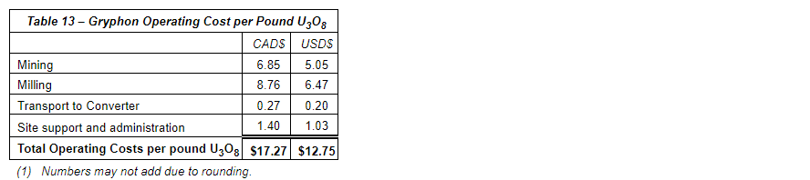 The Gryphon update remains at the PFS level of confidence, and opportunities remain to complete additional studies to further advance confidence in the project plans. There are notable opportunities for optimization of the Gryphon mine design, including: (i) additional exploration drilling may increase estimated mineral resources, which with further studies, could increase available probable reserves to support an extended mine life; (ii) increasing the shaft depth could improve the ramp-up schedule of the mine and allow for earlier production; (iii) selecting a conventional method of shaft sinking by reusing ground freezing equipment potentially available from the Phoenix operation could improve schedule and reduce risks associated with blind boring; (iv) radiometric ore sorting underground could significantly reduce the quantity of ore to be transported to the mill for processing and could result in material reductions in transportation and milling costs; and (v) the addition of a grinding and leaching circuit at Gryphon to produce UBS to feed the processing plant proposed for the Phoenix operation, potentially reducing offsite infrastructure operating and capital costs associated with the upgrades needed for the McClean lake mill and the extension of Highway 914.
