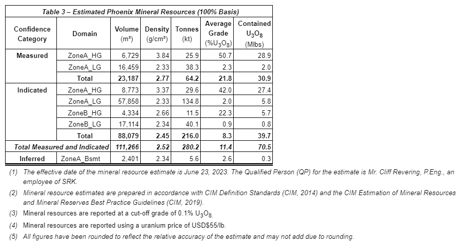 The Phoenix mineral resource estimate has been updated to reflect 70 additional drill holes completed since the previous mineral resource estimate from 2018. The additional drilling consisted primarily of test wells installed to support ISR derisking activities and certain targeted resource definition drill holes. As a result of the additional drilling, 30.9 million pounds of U3O8 have been upgraded from indicated mineral resources to measured mineral resources in recognition of the increased confidence in certain areas of Phoenix Zone A.