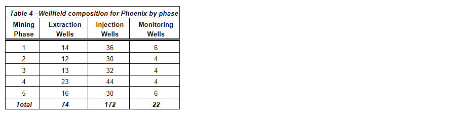 Based on the results of the mine planning process, mining activities have been divided into five phases, with a total of 74 extraction wells, 172 injection wells and 22 monitoring wells, as outlined in the table entitled "Wellfield composition for Phoenix by phase."