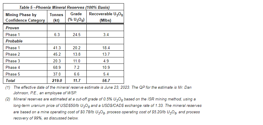 The base-case economic analysis assumes uranium sales from Phoenix mine production will be made from time to time throughout the production period at the forecasted annual composite midpoint uranium spot price from the Q2 2023 uranium market outlook (UMO) issued by UxC LLC, which is stated annually in constant (non-inflated) 2023 dollars and ranges from approximately $66 (U.S.) to $70 (U.S.) per pound U3O8 during the indicative production period of the Phoenix operation. This is the same pricing methodology applied for Phoenix as the base-case scenario in the 2018 PFS, where the composite midpoint uranium prices during the indicative years of production then ranged from only $29 (U.S.) to $45 (U.S.) per pound U3O8 in constant 2018 dollars. Consistent with the 2018 PFS, the overall cost profile and construction timeline of the planned Phoenix ISR mine is not expected to require substantial contract base loading to justify development. Accordingly, the spot price indicator from UxC has been used for the Phoenix base-case economic analysis.