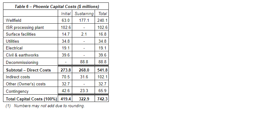 Initial capital costs are expected to be incurred during a 24-month construction period that will include the establishment of site infrastructure (discussed above), as well as the freeze wall perimeter around the phase 1 mining zone and initial wellfield development within phase 1.