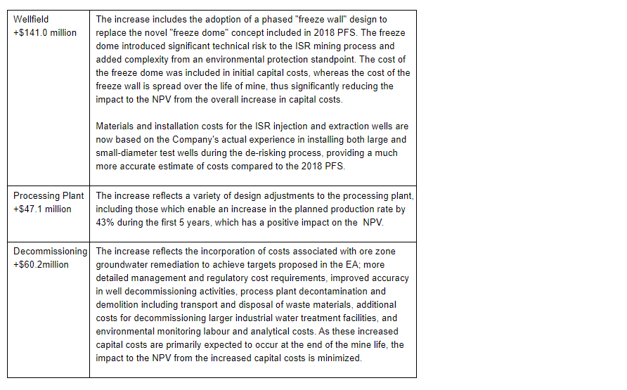 As is demonstrated by the project's current NPV in the PFS reference case (up 5 per cent from the 2018 PFS), the economic outcome of the project has not been adversely impacted by the increase in life of mine capital costs. Significant contributors to the overall increase in capital costs include the wellfield, ISR processing plant and decommissioning costs, as further described in the associated table.