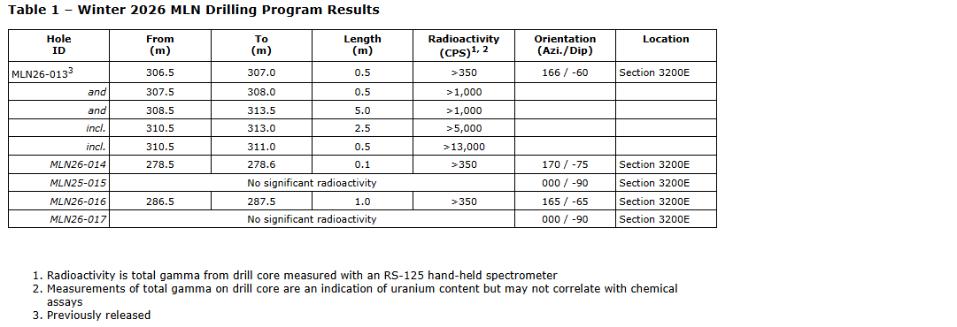 Andy Carmichael, vice-president of exploration, commented: "Intersecting five metres of continuously anomalous radioactivity in the second round of drilling at Cyclone significantly upgrades the trend. Though warming conditions curtailed follow-up, the additional holes resulted in additional radioactive intercepts separate from that of MLN26-013 and a deeper understanding of the trend's geology which will be invaluable during future drilling. With 600 metres of open strike length in either direction along a mineralized structural corridor, we're eager to resume drilling in summer 2026."