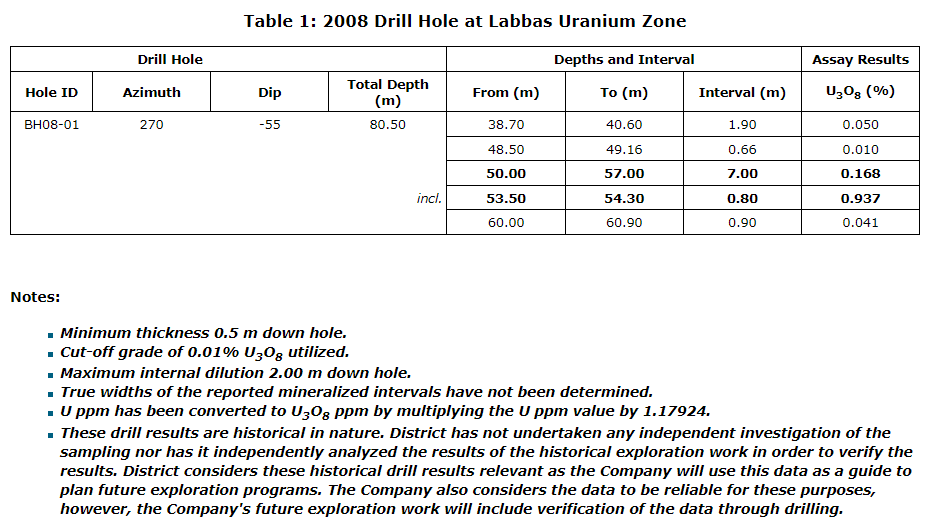 The data disclosed in this news release are related to mineral resource estimates that are considered to be historical estimates under National Instrument 43-101 -- Standards of Disclosure for Mineral Projects. A qualified person has not done sufficient work to classify the historical estimate as a current mineral resource, and the company is not treating these historical estimates as current mineral resources. The company would need to conduct an exploration program, including twinning of historical drill holes in order to verify the Labbas uranium zone historical estimate as a current mineral resource.
