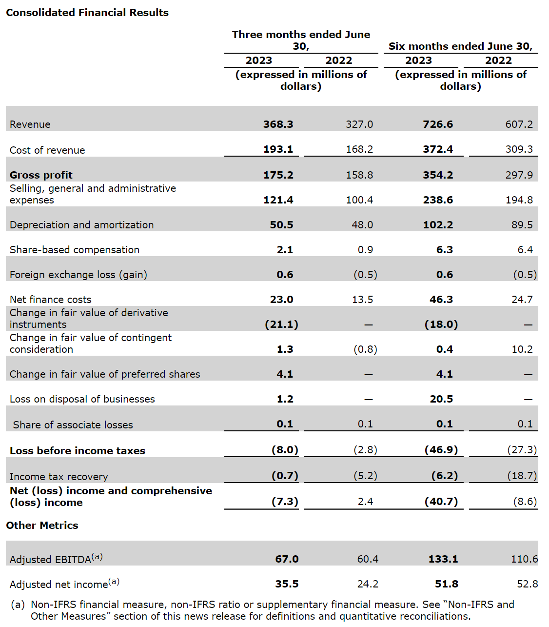 Adjusted EBITDA increased to $67-million in the second quarter of 2023, an increase of 10.9 per cent compared with the second quarter of 2022. Adjusted EBITDA margin of 18.2 per cent in the second quarter of 2023 was lower compared with 18.5 per cent during the corresponding period in 2022 due to inflationary labour pressures.