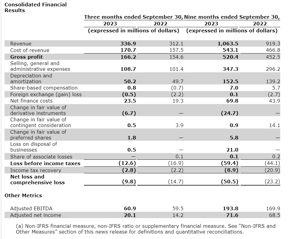 - Adjusted net income for the quarter was $20.1-million, an increase of 41.5 per cent compared with $14.2-million in the third quarter of 2022.