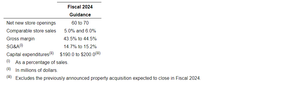 - No significant changes in the capital budget for fiscal 2024 for new-store openings, maintenance capital expenditures and transformational capital expenditures, the latter being mainly related to information technology projects and which budget excludes the purchase price for the previously announced property acquisition;