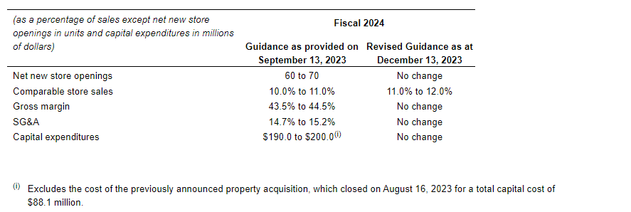 - No significant changes in the capital budget for fiscal 2024 for new store openings, maintenance capital expenditures and transformational capital expenditures, the latter being mainly related to information technology projects and which budget excludes the purchase price for the previously announced property acquisition, which closed on Aug. 16, 2023;