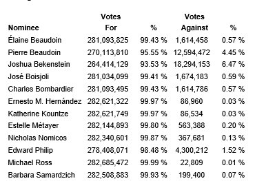 At the meeting, all of the nominees for directors listed in the company's management proxy circular dated April 27, 2023, were elected by a majority of the votes cast by shareholders present or represented by proxy. Voting results for each nominee are set out herein.