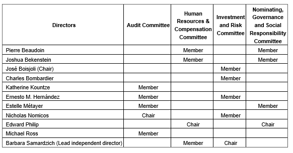 Nicholas Nomicos has joined the investment and risk committee, replacing Mr. Laporte, while Michael Ross joined the audit committee. As a result of the foregoing changes, the composition of the board committees is set out herein.