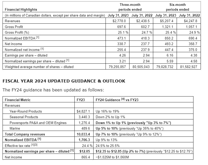 BRP Inc. has released its financial results for the three- and six-month periods ended July 31, 2023. All financial information is in Canadian dollars unless otherwise noted. The complete financial results are available on SEDAR+ and EDGAR as well as in the quarterly reports section of BRP's website.