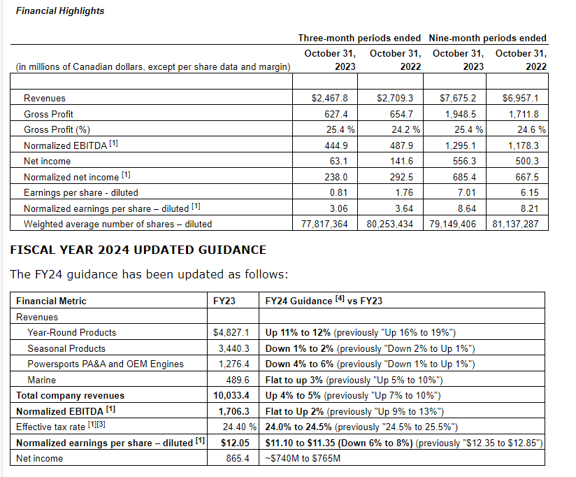 BRP Inc. has released its financial results for the three- and nine-month periods ended Oct. 31, 2023. All financial information is in Canadian dollars unless otherwise noted. The complete financial results are available on SEDAR+ and EDGAR as well as in the quarterly reports section of BRP's website.