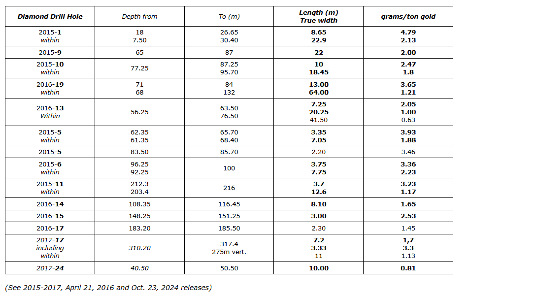 Hole 19 is 50 m south of hole 1 (2.13 g/t Au/22.9 m), of hole 9 (two g/t Au/22 m) and of hole 10 (1.8 g/t Au/18.45 m).