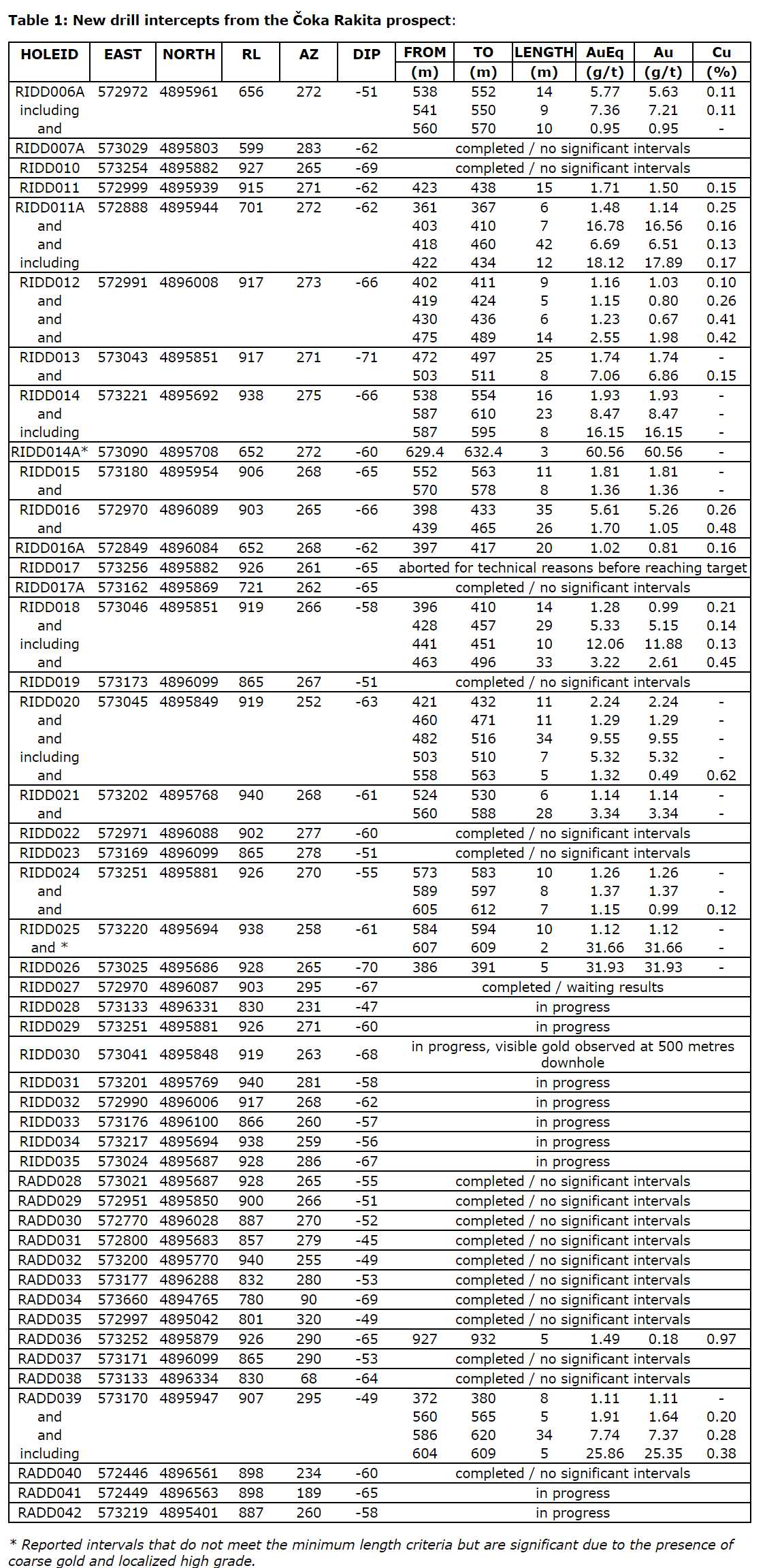 - RADD039 - 5 metres at 1.64 g/t Au and 0.2% Cu from 560 metres depth and 34 metres at 7.37 g/t Au and 0.28% Cu from 586 metres depth (including 5 metres at 25.35 g/t Au and 0.38% Cu from 604 metres depth)