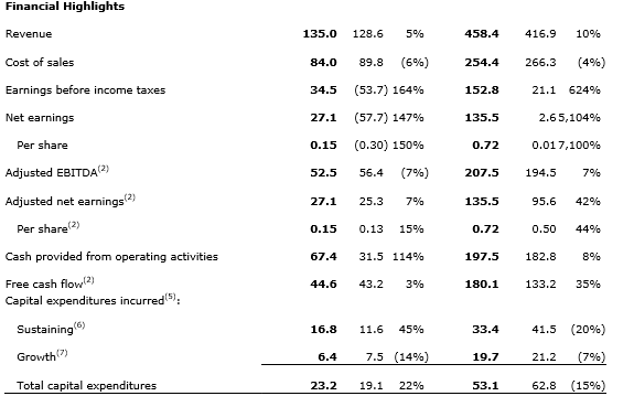Solid adjusted net earnings: reported net earnings of $27.1-million (15 cents per share) and adjusted net earnings of $27.1-million (15 cents per share);
