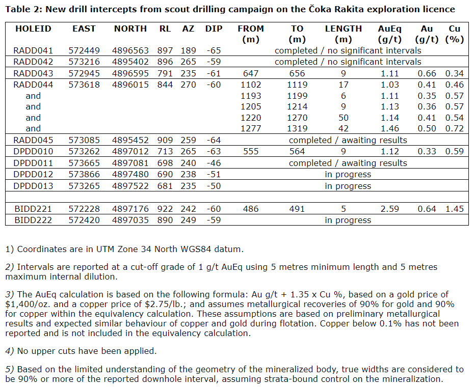 For details of the Coka Rakita scout drilling program, refer to the table entitled "New drill intercepts from scout drilling campaign on the Coka Rakita exploration licence."
