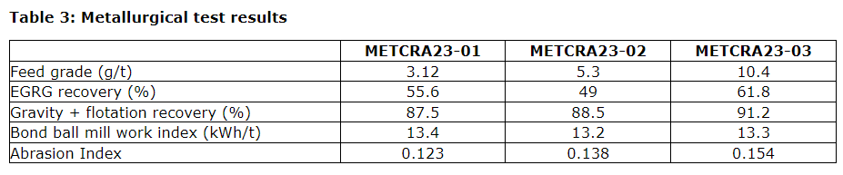 Three representative 150-kilogram composite samples were tested at Base Metallurgical Laboratories in Kamloops, B.C. Extended gravity recoverable gold (EGRG) testing demonstrated gravity recoverable gold ranging from 49 per cent to 62 per cent from these samples. Rougher flotation tests on the gravity tails at a P80 grind size of 53 micrometres achieved overall gold recoveries ranging from 90 per cent to 96 per cent for the three composite samples. Adjusting for cleaner flotation losses, the results indicate total achievable gold recovery from a gravity and flotation circuit ranges from 88 per cent to 91 per cent.