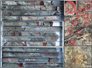 a) Core trays with HQ size half-core from 469.2 to 480.4 metres downhole with gold grades and marked visible gold aggregates (red circles). Red arrows indicate gold present on the other side of the core.