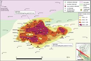 - Results confirm and locally extend the high-grade core of mineralization: Results from RIDT025, RIDT026 and RIDT028 confirm the high-grade nature of the mineralized body and provide additional confidence in the continuity of the mineralization (see Figure 1). High-grade intercepts from holes RIDT025 and RIDT028 extend the high-grade core by 80 metres to the south and 70 metres to the east-northeast, respectively, of hole RADDMET001 (which included the previously announced intercept of 40 metres at 63.43 g/t Au and 0.11% Cu from 517 metres depth).1