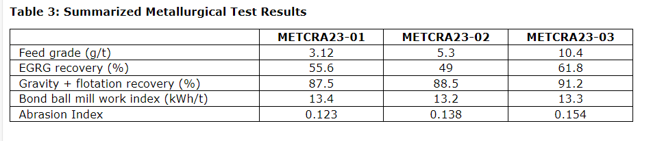 As previously reported on Nov. 15, 2023, metallurgical test work confirmed the viability of a combined gravity concentration and flotation circuit at different target grades.