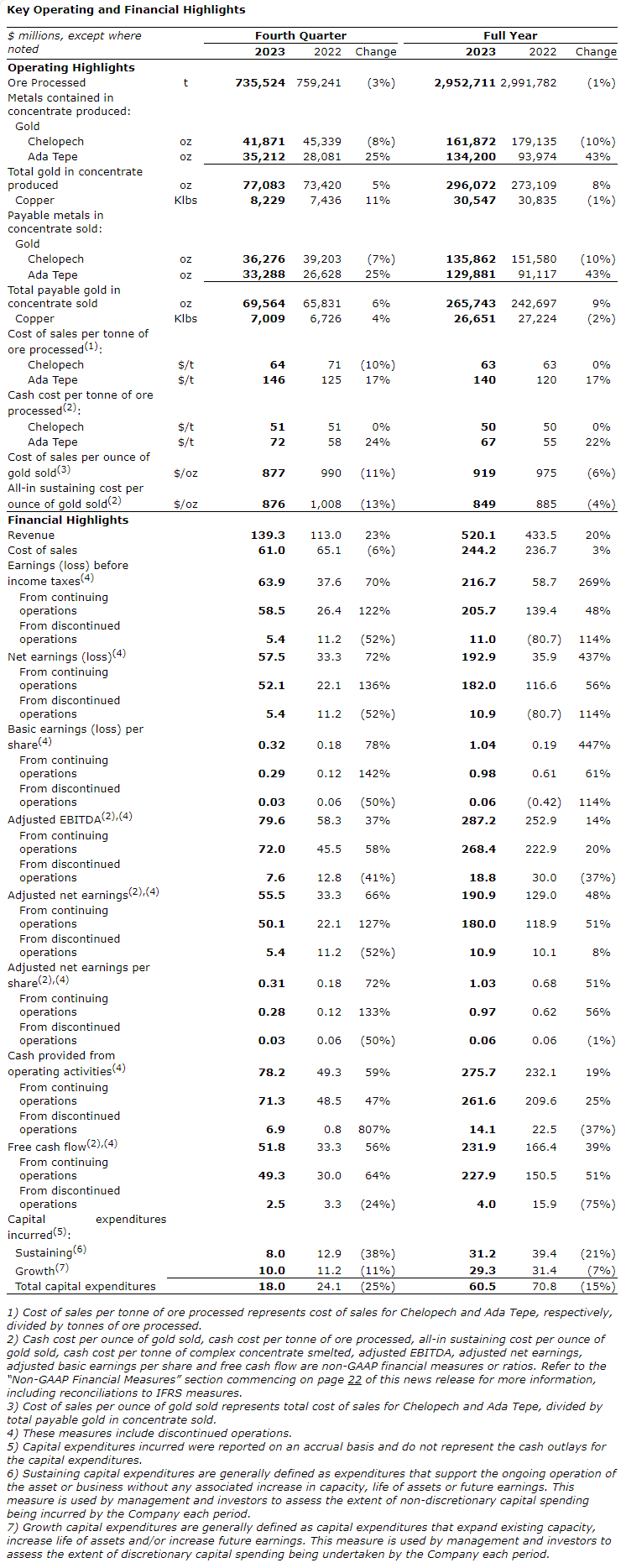 - Deliveries: Payable gold in concentrate sold in the fourth quarter and full year of 2023 of 69,564 ounces and 265,743 ounces, respectively, was 6% and 9% higher than the corresponding periods in 2022 primarily reflecting higher gold production.