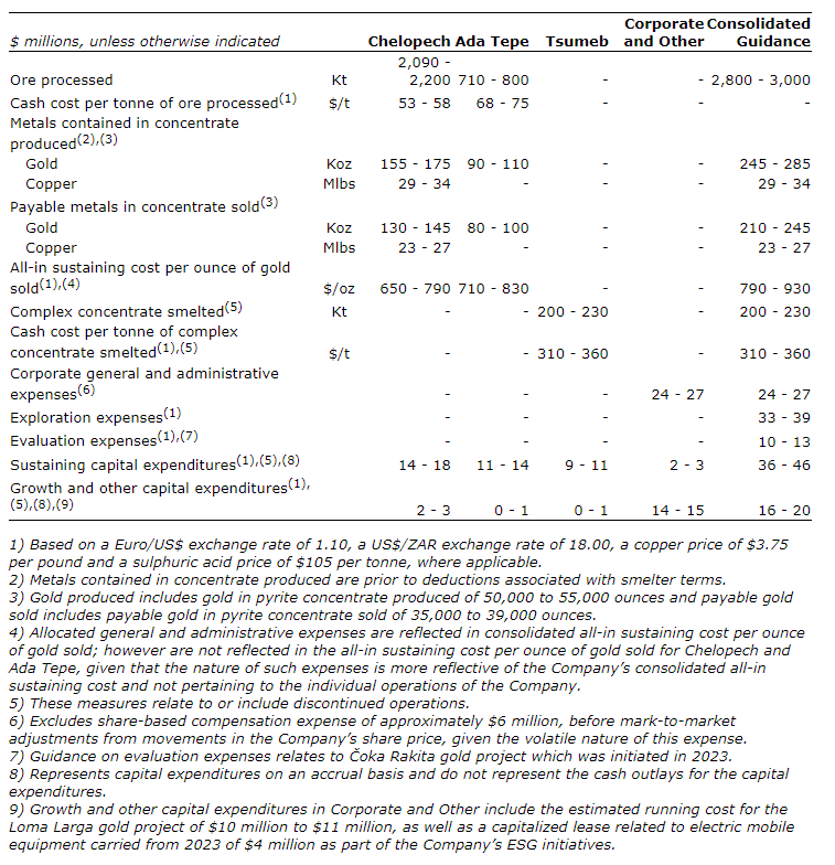 All-in sustaining cost per ounce of gold sold in 2024 is expected to be lower than 2023, due primarily to lower treatment charges as all Chelopech concentrates will now be delivered to third-party smelters, partially offset by higher local currency operating costs.