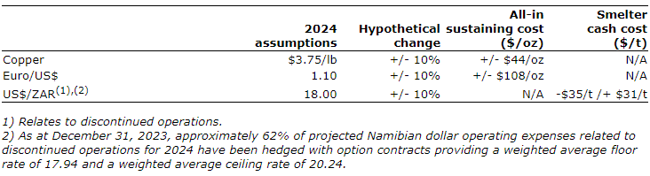 Certain key cost measures in the Company's detailed guidance for 2024 are sensitive to market assumptions, including copper price and foreign exchange rates. The following table demonstrates the effect of a 10% change in these market assumptions on the consolidated all-in sustaining cost as well as the smelter cash cost from discontinued operations provided in the 2024 guidance.