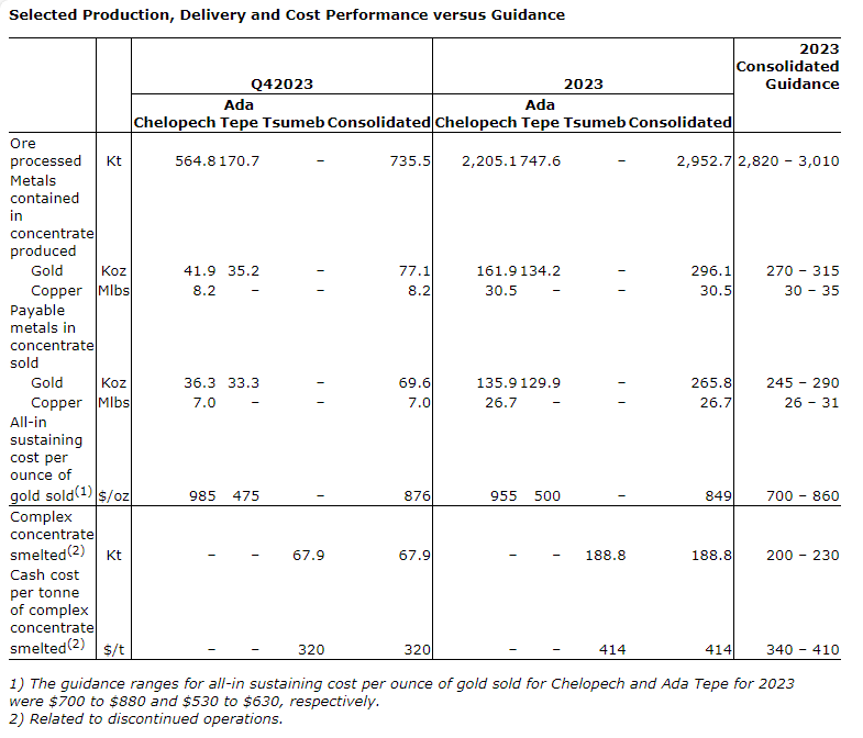 In the fourth quarter of 2023, the Company's mining operations continued to perform well and delivered another quarter of strong production. Ada Tepe achieved record quarterly gold production, and production from Chelopech was in-line with expectations.