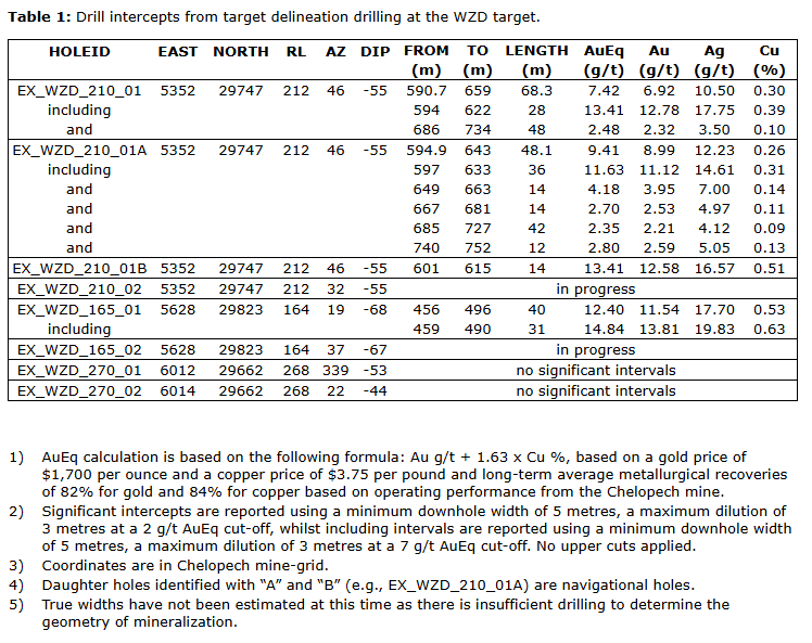 EX_WZD_210_01A: 48.1 metres grading 9.41 g/t AuEq, comprising 8.99 g/t Au, 0.26 per cent Cu and 12.23 g/t Ag, from 594.9 metres downhole, including 36 metres grading 11.63 g/t AuEq, comprising 11.12 g/t Au, 0.31 per cent Cu and 14.61 g/t Ag;