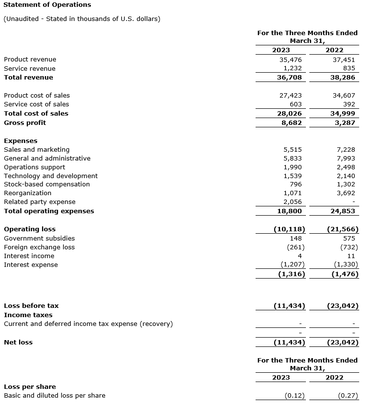 In response to these factors, it has taken a thoughtful look at its cost structure over the past three months. During the first quarter of 2023, as it discussed in its previous filings, it took actions to reduce annualized operating expenses by approximately $5.0-million. In addition, during the second quarter to date, it has taken additional actions that it expects to generate $4.0-million in annualized savings, including a planned head count reduction with annualized savings of approximately $3.1-million exclusive of termination benefits of $700,000. These reductions are designed to improve efficiencies and streamline its back office and order fulfilment processes in light of the longer-range uncertainty. These actions are not expected to have a material impact on product delivery.