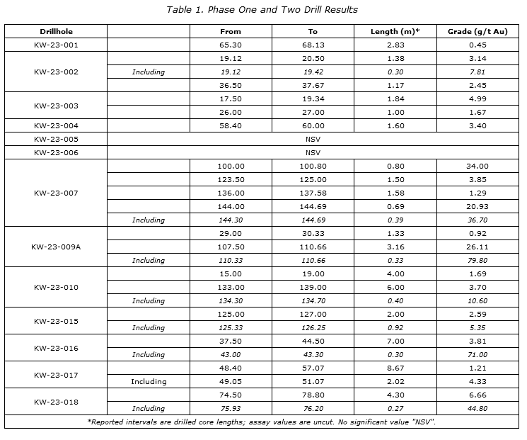 - Confirmed orientation and expanded historically delineated high-grade shoot with new holes KW-23-016 which intersected 3.81 g/t gold over 7.00 m including 71.00 g/t gold over 0.30 m and KW-23-018 intersecting 6.66 g/t gold over 4.30 m including 44.80 g/t gold over 0.27 m.