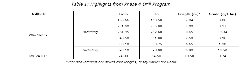 The company drilled two holes to test for potential depth extension and to determine the direction of the plunge of the new high-grade shoot on BM2, which was theorized and successfully targeted in phase 2 of the drill program with hole KW-23-010. Hole KW-24-009 was a stepout to the south and was drilled 100 metres down plunge of phase 2 drilling. This hole intersected 3.17 g/t gold over four metres, including 19.34 g/t gold over 0.65 metre. These high-grade shoots typically have robust down-plunge continuity. Through additional interpretation, the geology team believes there is strong potential for this new high-grade shoot to come to surface and will test this in future drill phases.