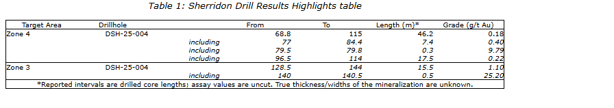 Dryden Gold Corp. has released drill results from second pass drilling at its Sherridon gold discovery. This includes a broad interval of near-surface gold mineralization in hole DSH-004 which returned 1.10 grams per tonne gold over 15.50 metres, including 0.50 metre grading 25.20 g/t gold. Hole DSH-004 was drilled 150.00 metres east and expands the mineralization that was intersected by hole DSH-25-001 released Oct 14, 2025.