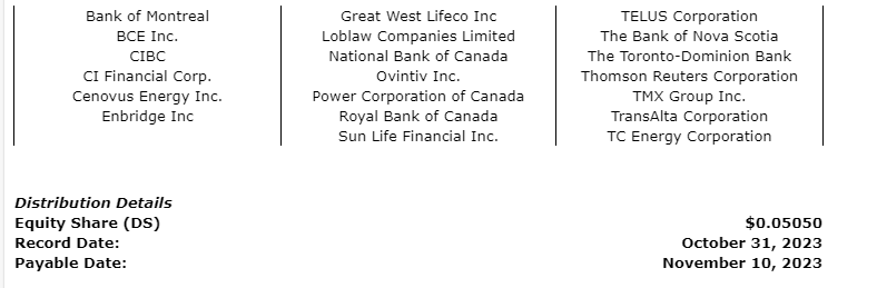 The company invests in a portfolio of 15 Canadian companies selected from 20-company universe which are among the highest Canadian dividend-yielding stocks.