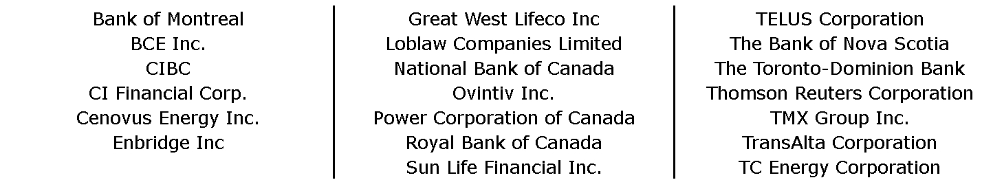The Company invests in a portfolio of 15 Canadian companies selected from the following 20 company universe which are among the highest Canadian dividend yielding stocks.