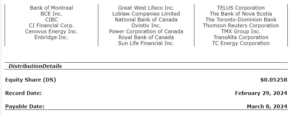 The company invests in a portfolio of 15 Canadian companies selected from the 20-company universe noted herein which are among the highest Canadian dividend-yielding stocks.