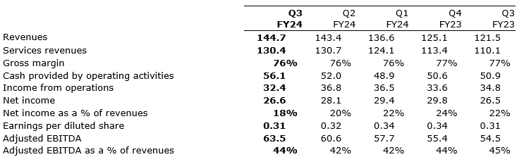 • Adjusted EBITDA (earnings before interest, taxes, depreciation and amortization) of $63.5-million, up 17 per cent from $54.5-million in Q3 FY 2023 and up 5 per cent from $60.6-million in Q2 FY 2024. Adjusted EBITDA as a percentage of revenues was 44 per cent, compared with 45 per cent and 42 per cent in Q3 FY 2023 and Q2 FY 2024, respectively.