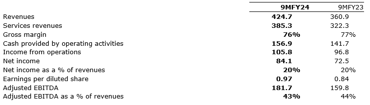 • Adjusted EBITDA of $181.7-million, up 14 per cent from $159.8-million in the nine months of FY 2023. Adjusted EBITDA as a percentage of revenues was 43 per cent, compared with 44 per cent in the nine months of FY 2023.