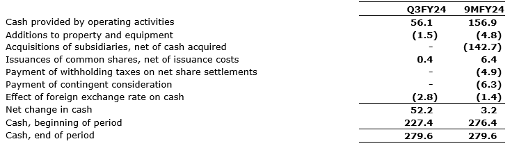 • Cash provided by operating activities of $56.1-million, up 10 per cent from $50.9-million in Q3 FY 2023 and up 8 per cent from $52.0-million in Q2 FY 2024;