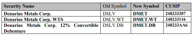 confirmed a proposed change of symbols by Denarius Metals Corp., as set out in the attached table.