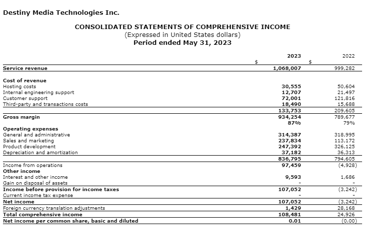 Destiny Media Technologies Inc. has released financial results for its fiscal 2023 third quarter ended May 31, 2023.