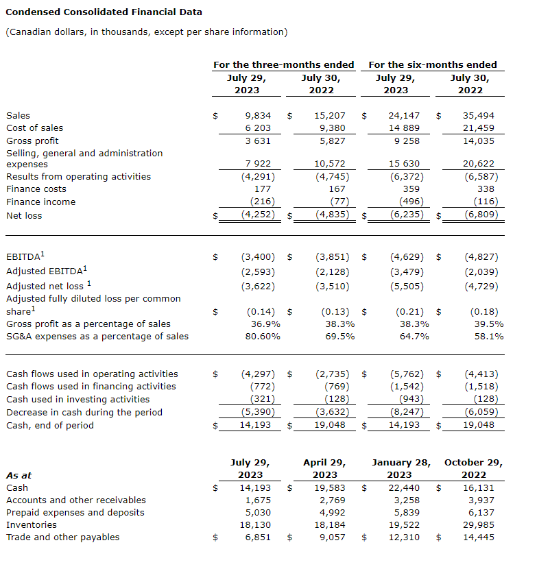 Net loss totalled $4.3-million in the quarter ended July 29, 2023, compared with a net loss of $4.8-million in the prior-year quarter. Adjusted net loss was $3.6-million in the second quarter compared with adjusted net loss of $3.5-million in the prior-year quarter.