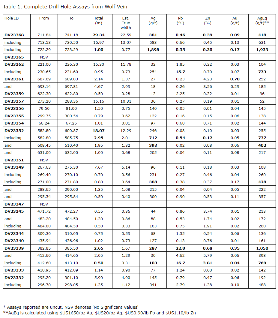 - DV23-368, southwest extension stepout: 381 g/t Ag, 0.46 per cent lead (Pb) and 0.39 per cent zinc (Zn) over 29.34 metres (22.59 metres estimated true width), including 1,898 g/t Ag over one metre (0.77 metre estimated true width) from a 75 m stepout.