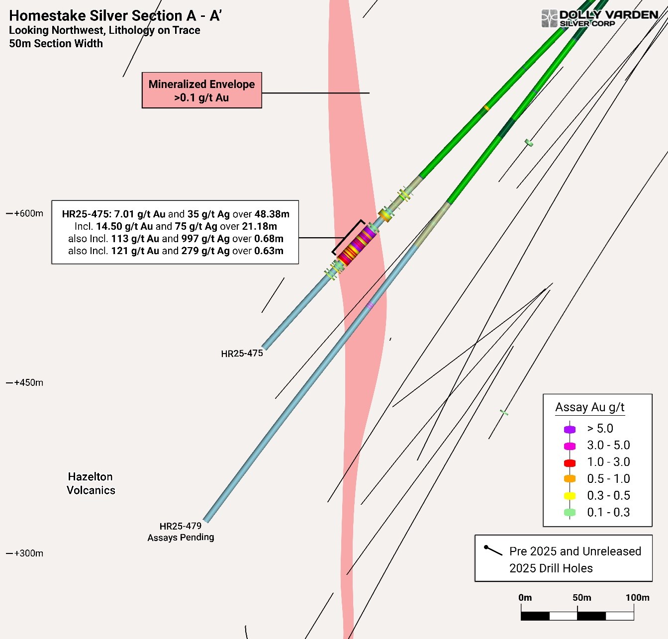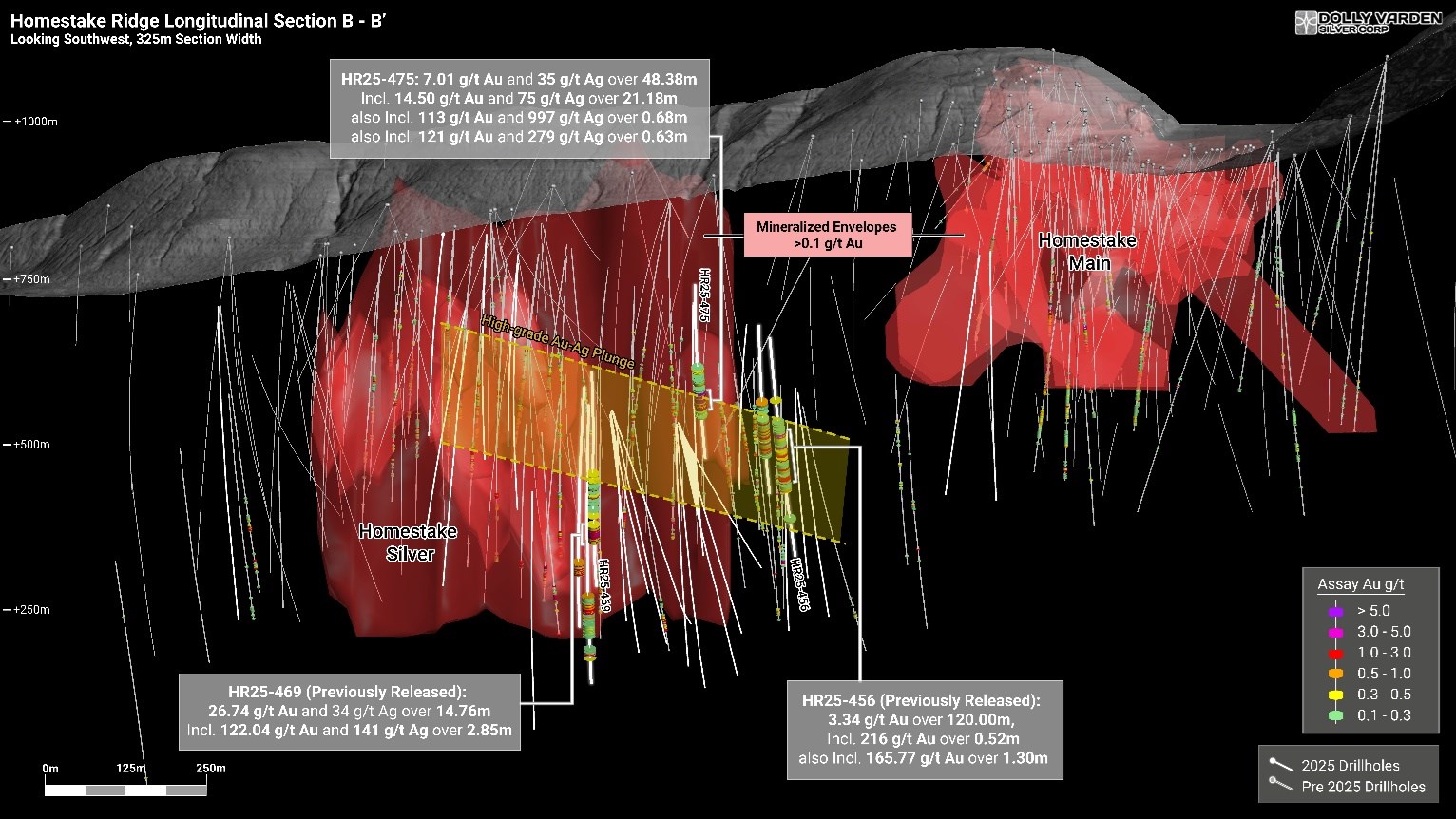 Vancouver, British Columbia--(Newsfile Corp. - December 4, 2025) - Dolly Varden Silver Corporation (TSXV: DV) (NYSE American: DVS) (FSE: DVQ) (the "Company" or "Dolly Varden") is pleased to report results from drilling that expands the high-grade gold mineralized plunge within the Homestake Silver deposit. Drill hole HR25-475 is a step-out 42 meters to the north and on the upper edge of the shallowly northerly plunging, high grade trend. The intercept grades 14.50 g/t Au and 75 g/t Ag over 21.18 meters, including 113 g/t Au and 997 g/t Ag over 0.68 meters and 121 g/t Au and 279 g/t Ag over 0.63 meters. The high-grade mineralization in HR25-475 is hosted within a broader mineralized zone grading 7.01 g/t Au and 35 g/t Ag over 48.38 meters.