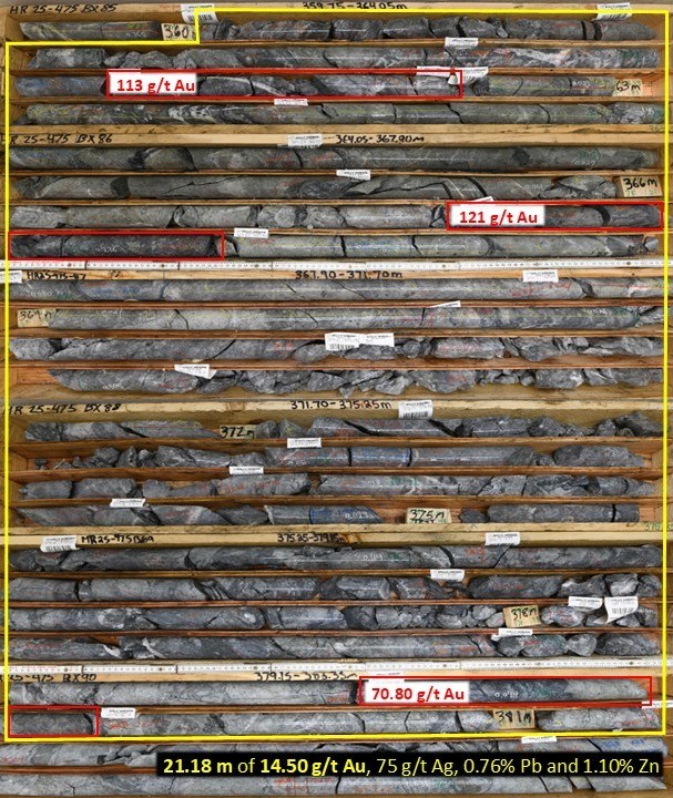 HR25-475: 14.50 g/t Au and 75 g/t Ag over 21.60 meters, including 113 g/t Au and 997 g/t Ag over 0.68 meters and 121 g/t Au and 279 g/t Ag over 0.63 meters within a total mineralized envelope grading 7.01 g/t Au and 35 g/t Ag over 48.38 meters.