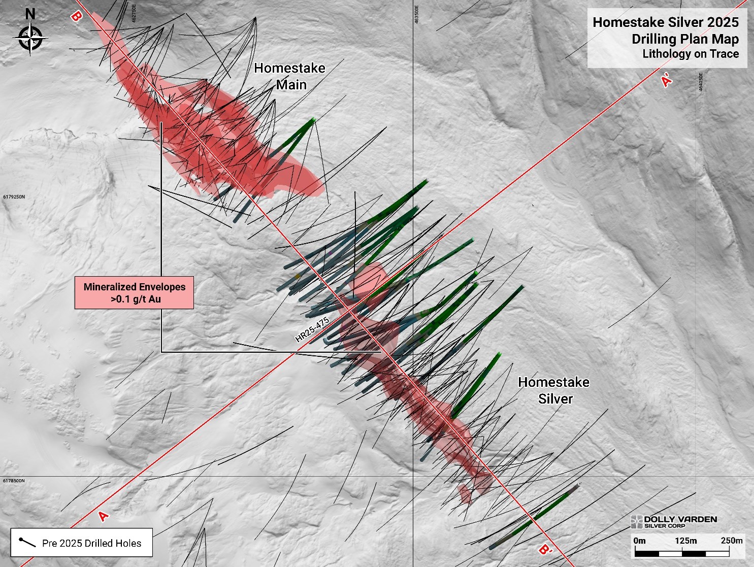 Drill hole HR25-475 is in 42 meters step-out to the north from HR24-448 (February 3, 2025 release) along plunge of the main gold and silver zone at the Homestake Silver deposit. The high-grade core of the Homestake Silver Deposit has been traced for over 300 meters vertically and extends for over 1,000 meters along plunge. The intercept occurs at the upper edge of the high-grade trend.